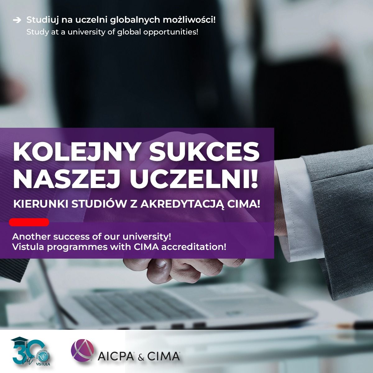 Programy licencjackie i magisterskie z zakresu finansów i rachunkowości oraz zarządzania – zarówno w języku polskim, jak i angielskim prowadzone w Vistuli – zostały akredytowane przez CIMA (Chartered Institute of Management Accountants).